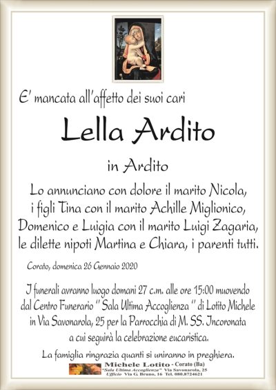 Pubblicazione in evidenza di un manifesto sul portale, posizionato tra i primi 10 annunci subito sotto quello del defunto, garantendo massima visibilità. Incluso anche un manifesto digitale presso la sala d’accoglienza e un manifesto cartaceo presso la chiesa. La posizione online segue l’ordine cronologico di pubblicazione.