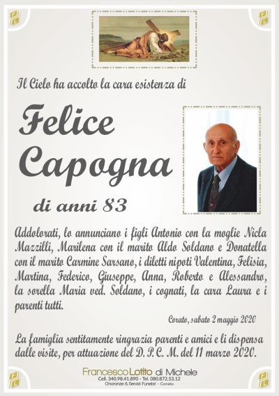 Il rito funebre è stato celebrato il giorno 3 maggio 2020