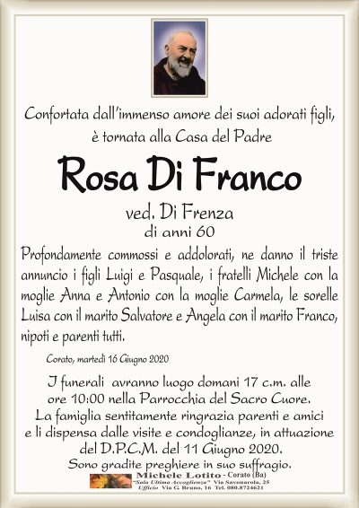 Pubblicazione in evidenza di un manifesto sul portale, posizionato tra i primi 10 annunci subito sotto quello del defunto, garantendo massima visibilità. Incluso anche un manifesto digitale presso la sala d’accoglienza e un manifesto cartaceo presso la chiesa. La posizione online segue l’ordine cronologico di pubblicazione.