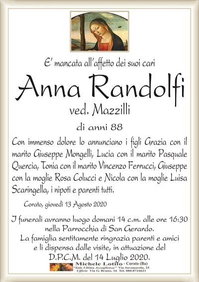Il rito funebre è stato celebrato il giorno 14 agosto 2020