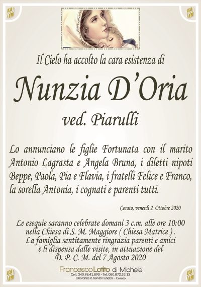 Il rito funebre è stato celebrato il giorno 3 ottobre 2020
