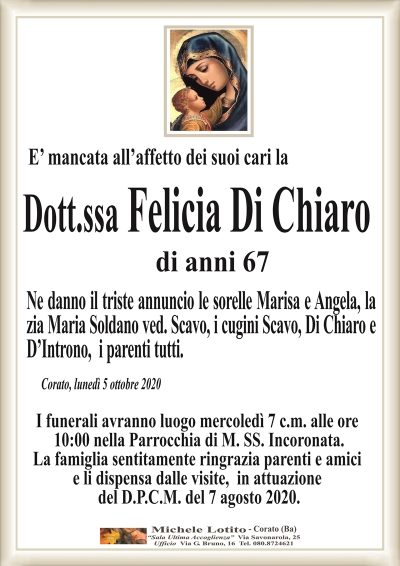 Il rito funebre è stato celebrato il giorno 7 ottobre 2020