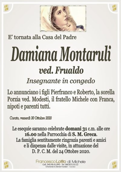 Il rito funebre è stato celebrato il giorno 31 ottobre 2020