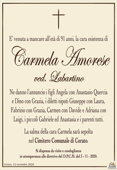 Il rito funebre è stato celebrato il giorno 12 novembre 2020