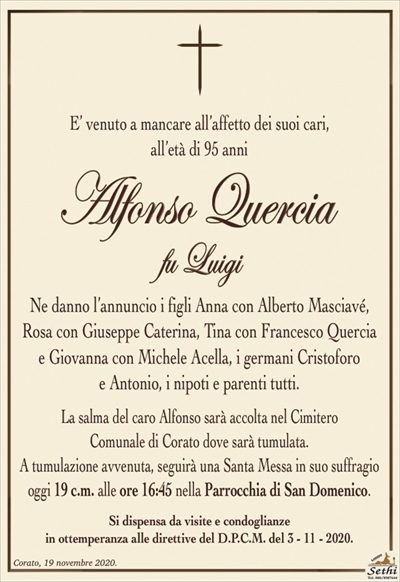 Il rito funebre è stato celebrato il giorno 19 novembre 2020