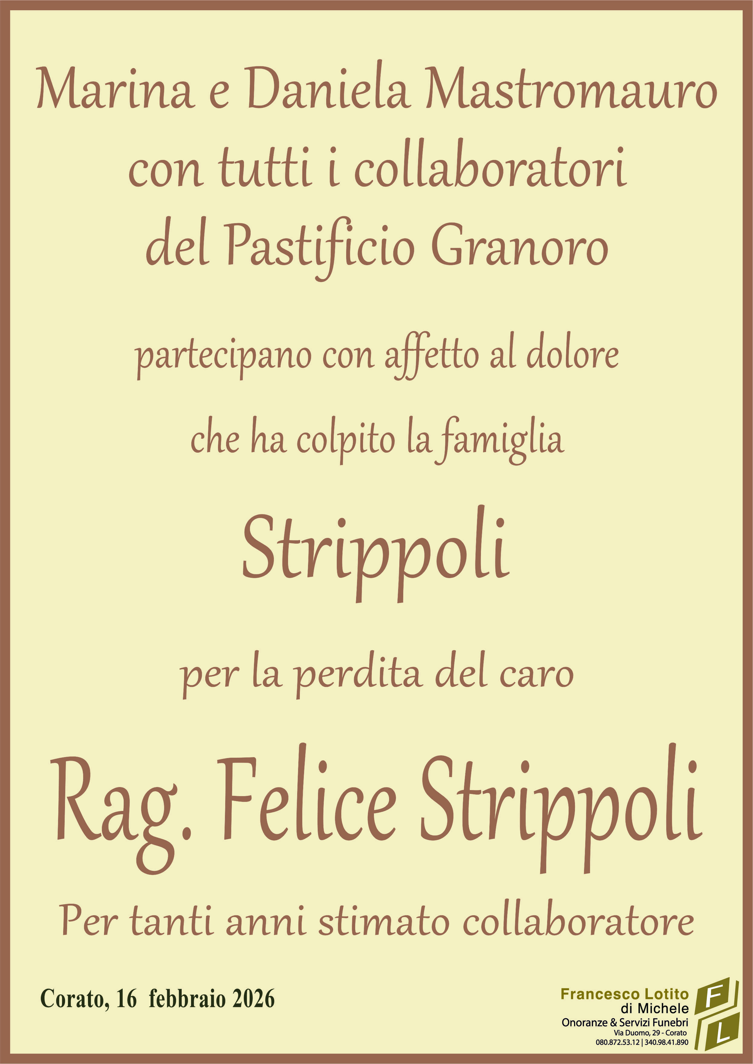 È venuto a mancare all'affetto dei suoi cari, all'età di 80 anni Felice Strippoli Ne danno il triste annuncio la moglie Antonietta Nocca, i figli Aldo con Flaviana Mangione, Fabrizio con Angela Tarantini e Maria con Luigi Riccardi, i diletti nipoti Emmanuel, Agata, Giulia, Edoardo e Virginia, la sorella Mariapia ved. Mastromauro, le cognate Maria Piccarreta ved. Nocca, Nicoletta Nocca ved. Maldera e Laura Nocca ved. Del Monte, i nipoti e parenti tutti. I funerali avranno luogo domani 17 c.m. alle ore 10:30 nella Parrocchia Maria Ss. Incoronata. La camera ardente è allestita presso la Casa Funeraria "Agenzia Sethi" in Via San Vito, 169.