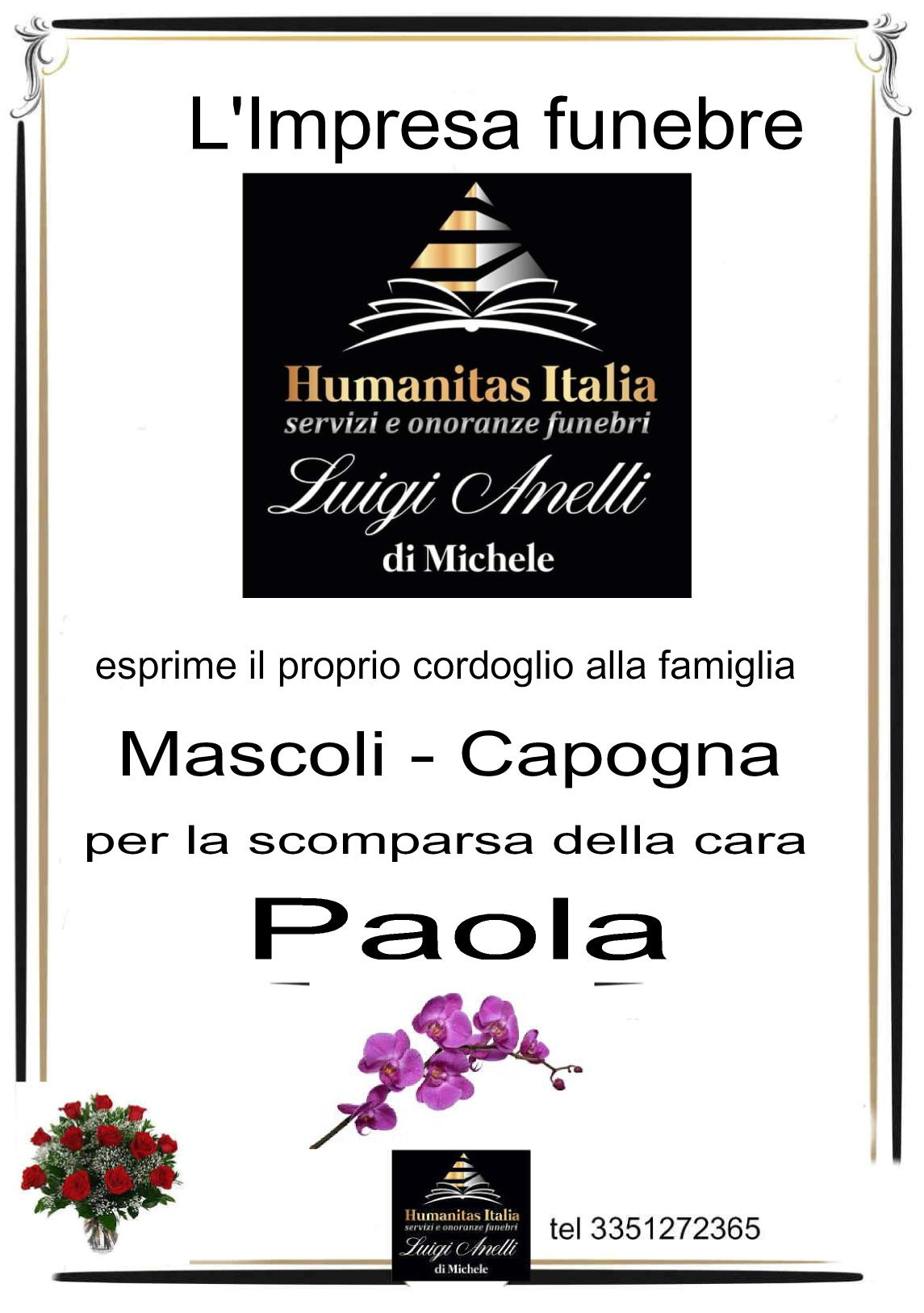 Si è spenta la cara esistenza di Paola Capogna in Mascoli Ne danno il triste annuncio il marito Giuseppe, la cara amica Enza con il marito Luigi Balducci, i cognati, cugini, nipoti e parenti tutti