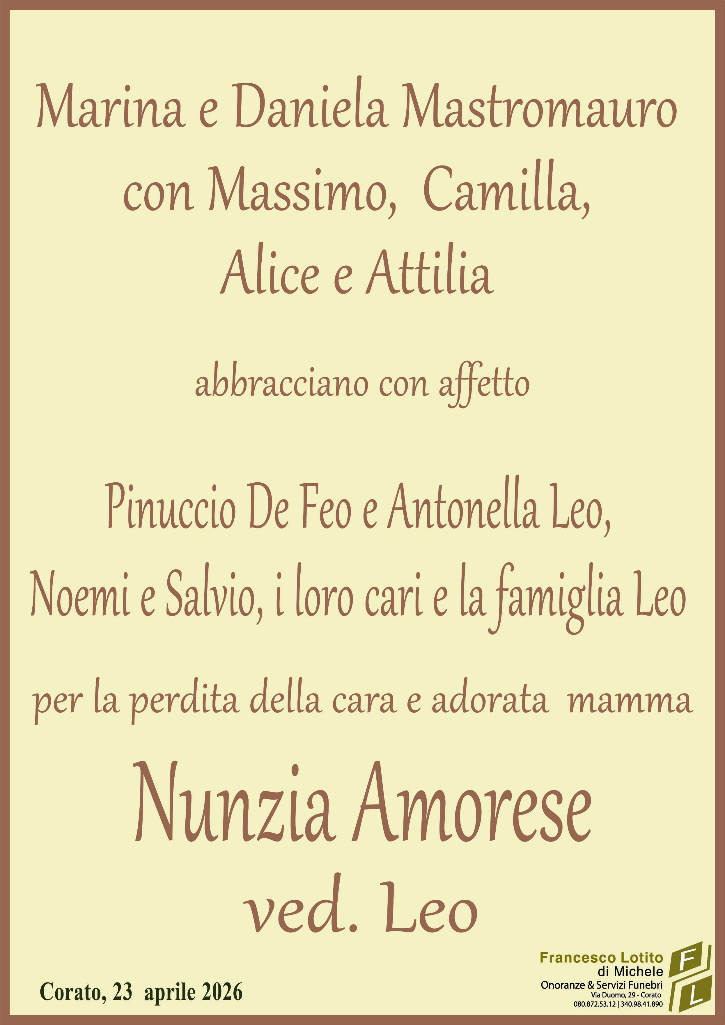Ne danno l’annuncio i figli Savino con Susanna Bozzon, Antonella con Giuseppe De Feo e Titty, i diletti nipoti Noemi con Fabio Inchingolo, Deborah con Mirko Inchingolo, Salvio, Jennifer, Jonathan e Sonia, la pronipote Gaia, i germani Leonardo con Anna, Cataldo con Lella, Rosa ved. Bucci e Ester con Dino, le cognate Maria, Giovanna e i parenti tutti.
