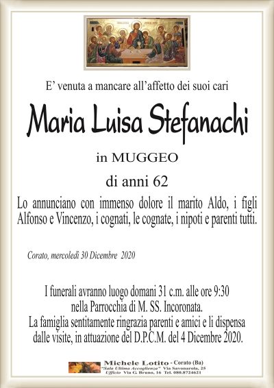 Il rito funebre è stato celebrato il giorno 31 dicembre 2020