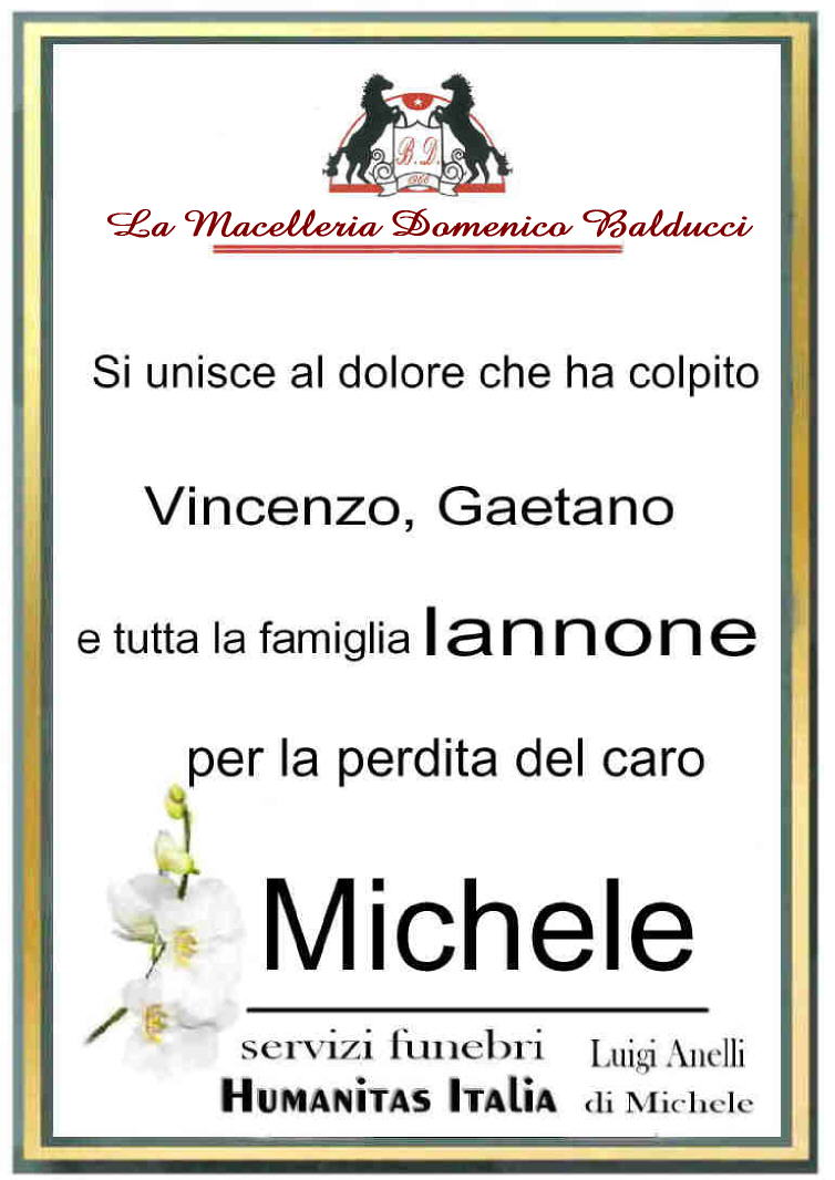 Lo annunciano con dolore la moglie Tina Balducci, i figli Vincenzo con Rosanna, Floriana con Savino, Gaetano con Luisa, gli amati nipoti Martina, Gaia, Flavia, Roberto, Agata e Teresa, e i parenti tutti.