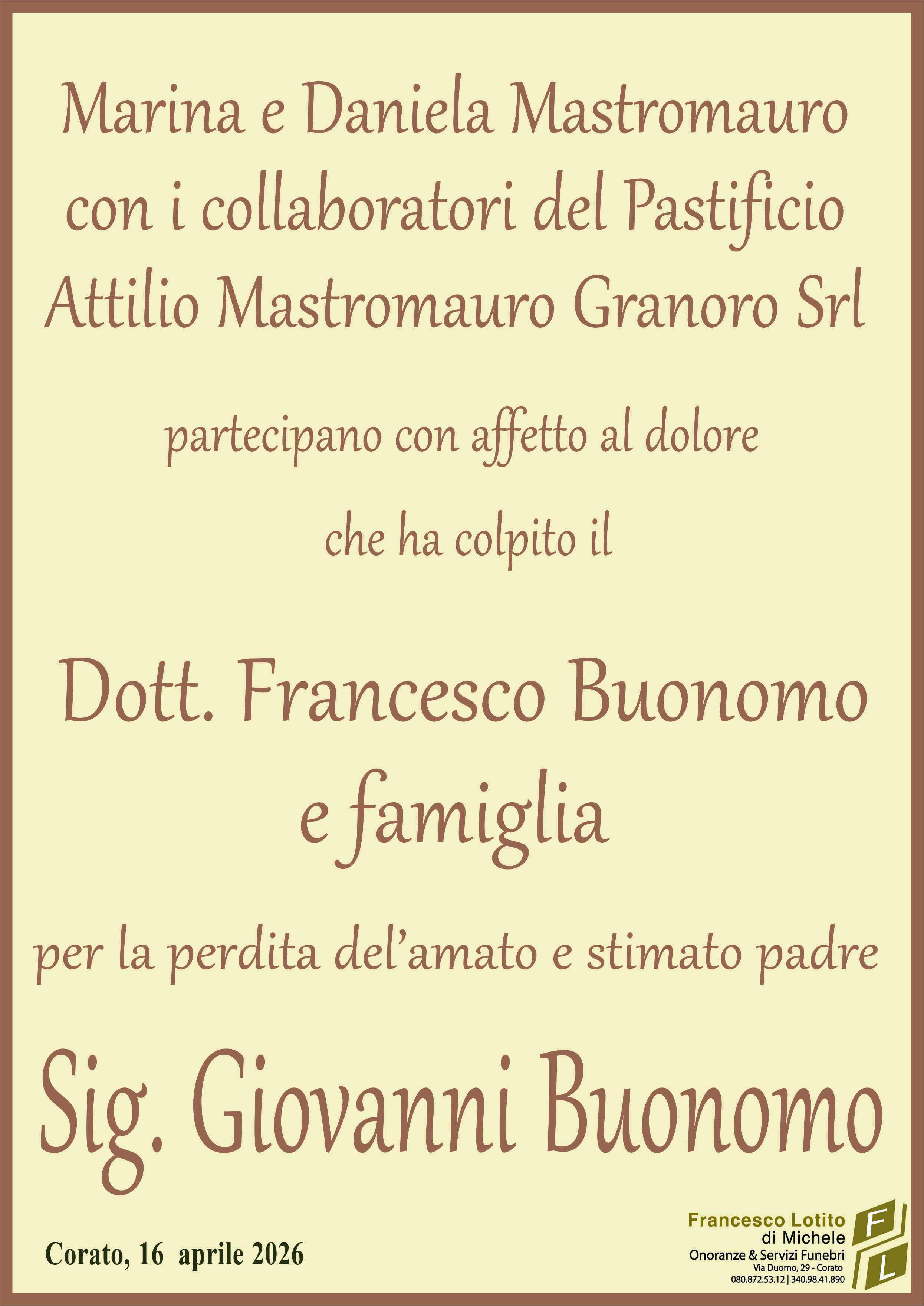 La famiglia accoglie parenti e amici presso Casa Funeraria "AGENZIA SETHI". Il rito funebre sarà celebrato domani 17 aprile alle ore 10:00 presso Parrocchia Maria SS. Incoronata - Corato, dove sarà possibile porgere l’ultimo saluto con rispetto e partecipazione.