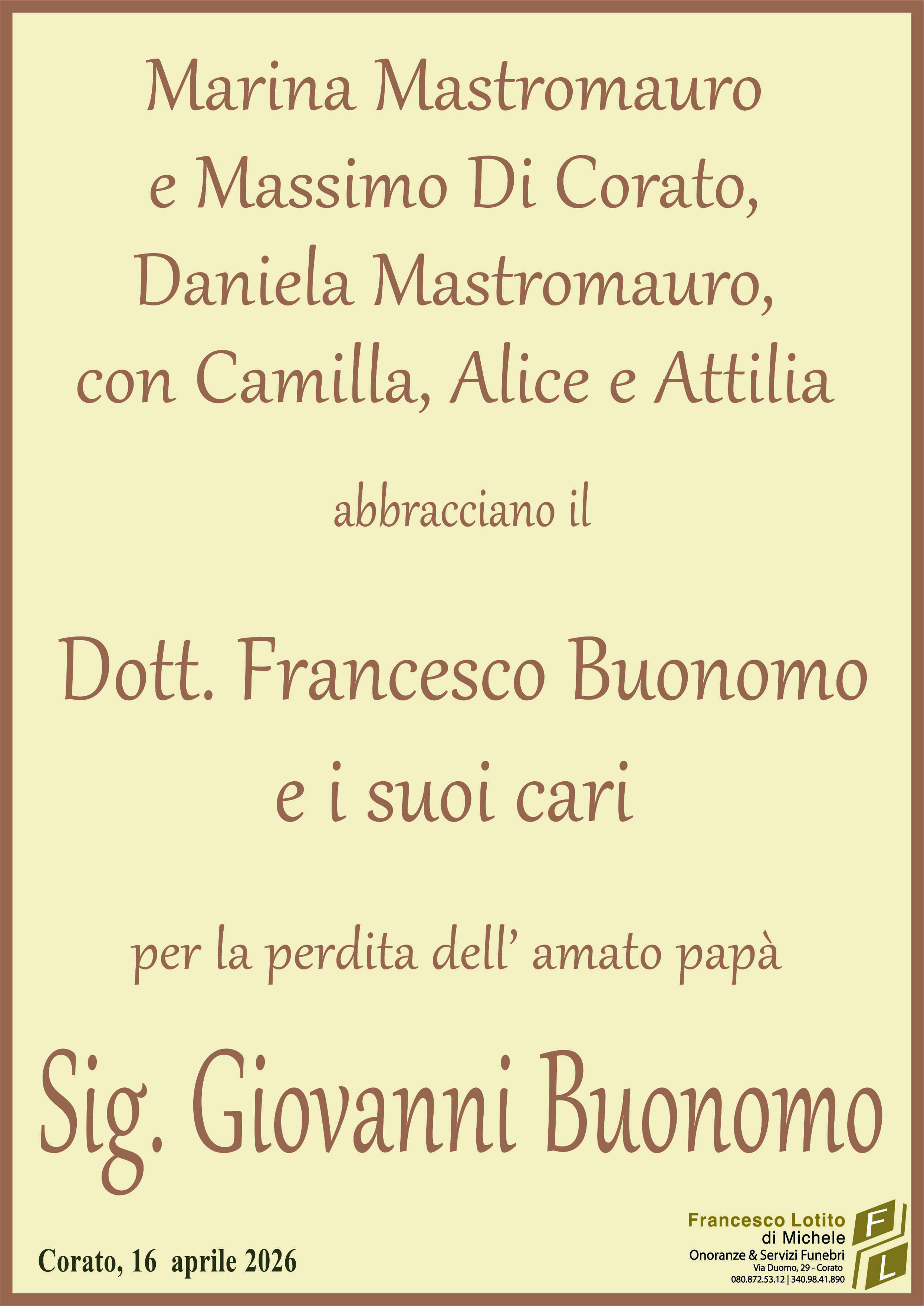 Ne danno l’annuncio ai figli Benedetta, Francesco con Jolanda De Palma e Felice con Maria Josè Marcone, la cognata Consiglia Torelli ved. Arbore, i diletti nipoti Angela, Gianfranco, Erika, Elisa, Giovanni, i piccoli pronipoti Gabriele, Gaia e i parenti tutti.